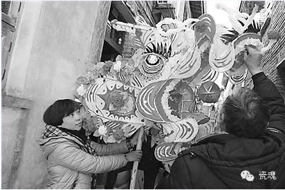 练师傅(右)在家人的协助下扎龙头 “三年了,就年初又接到一笔订单